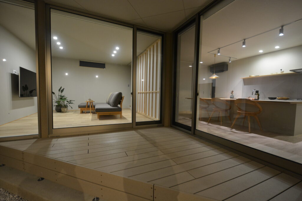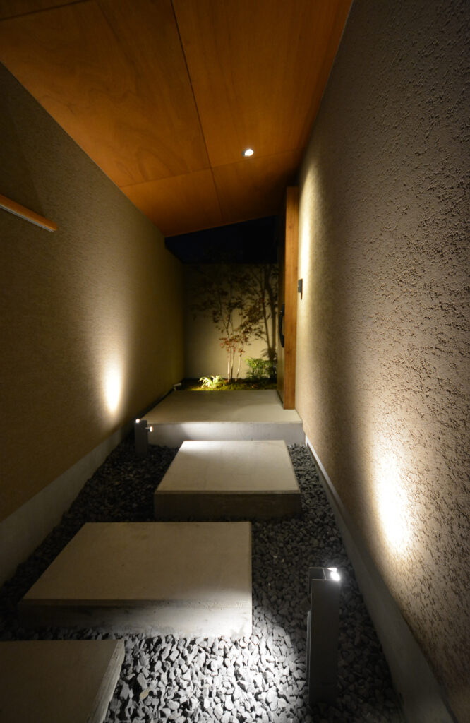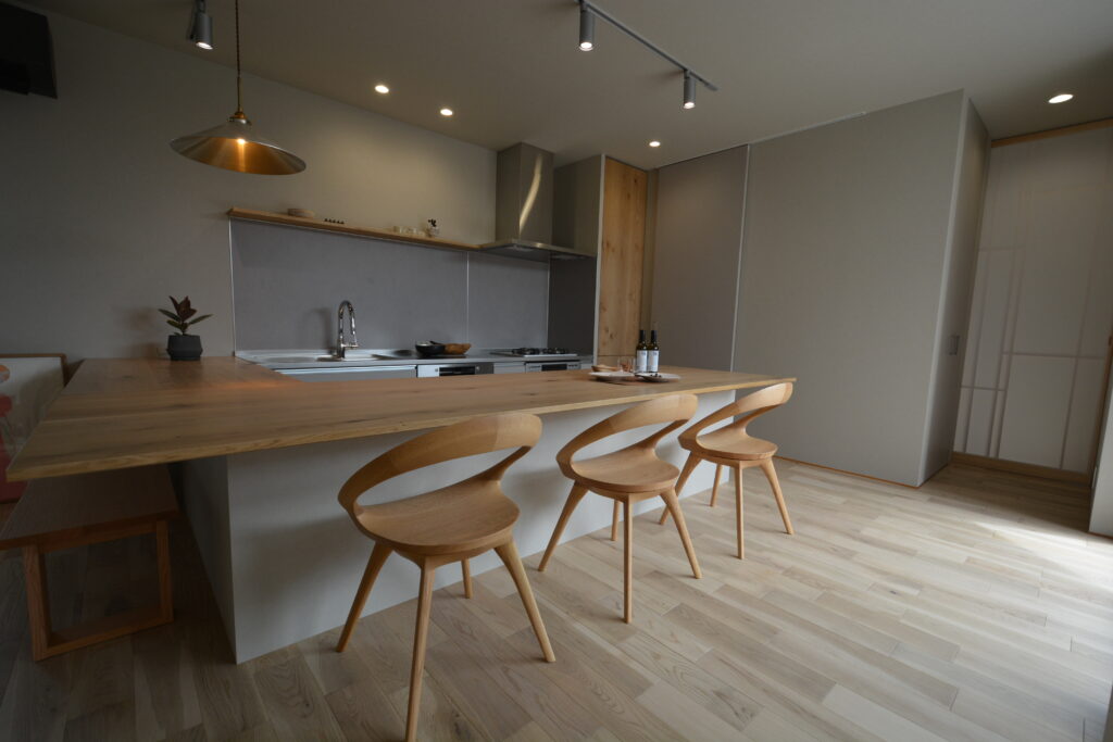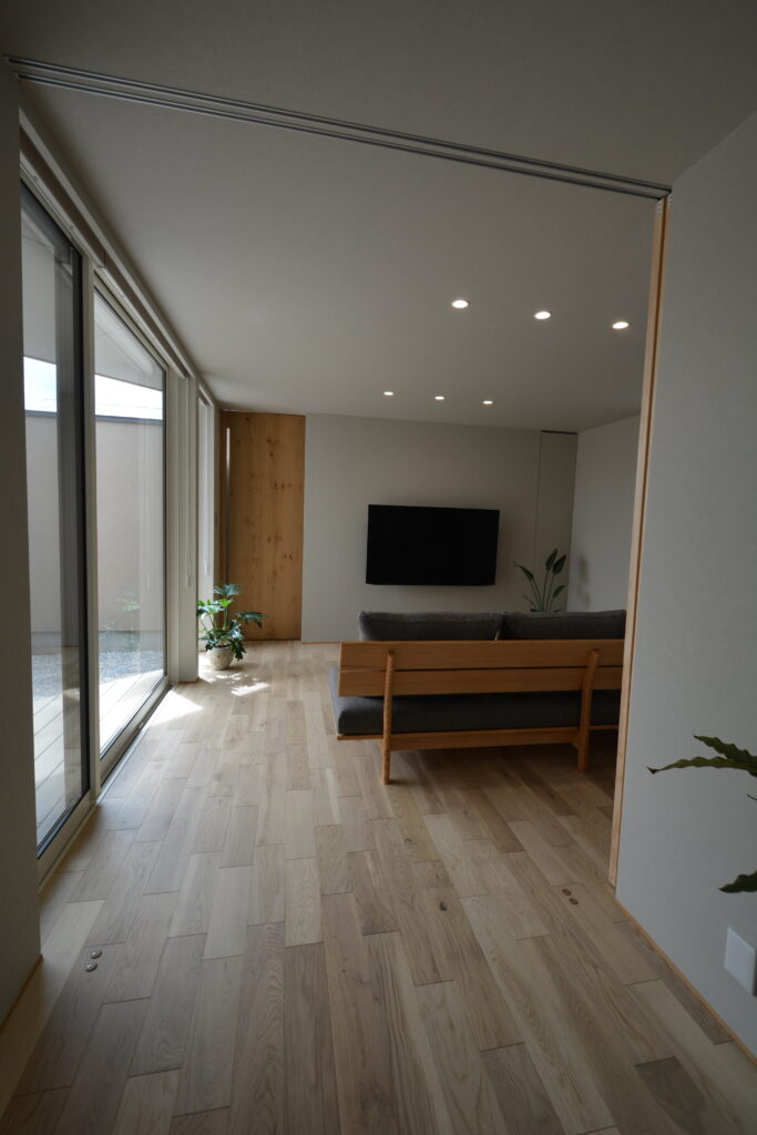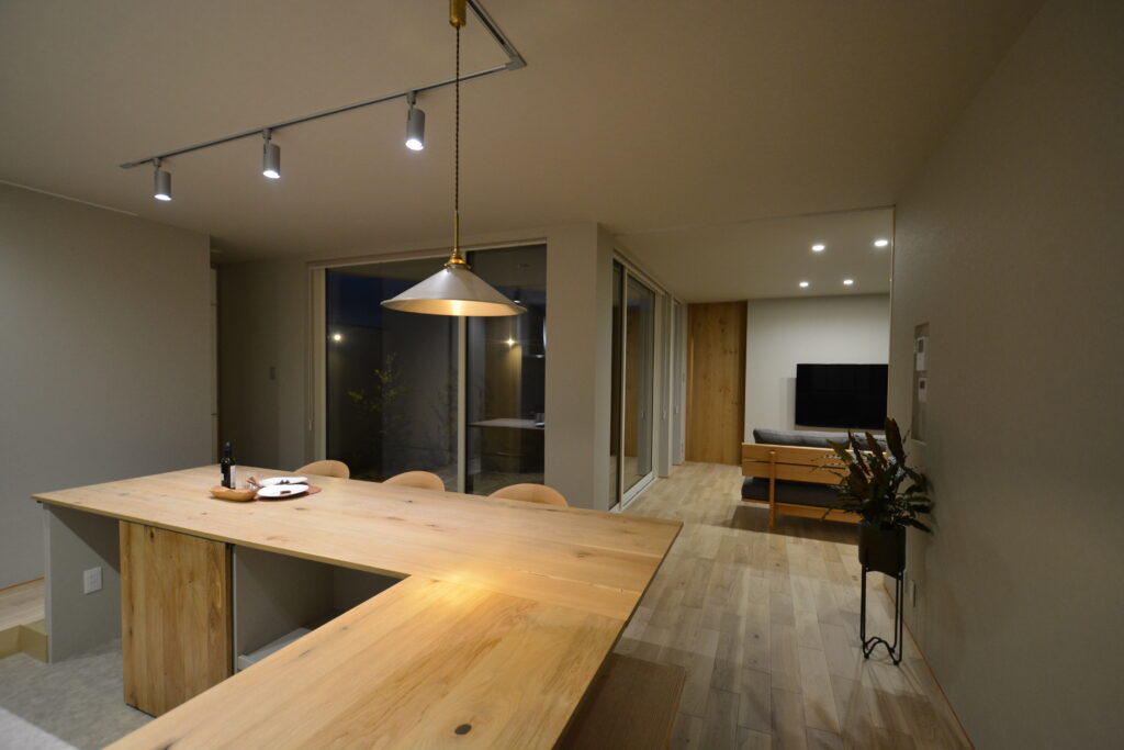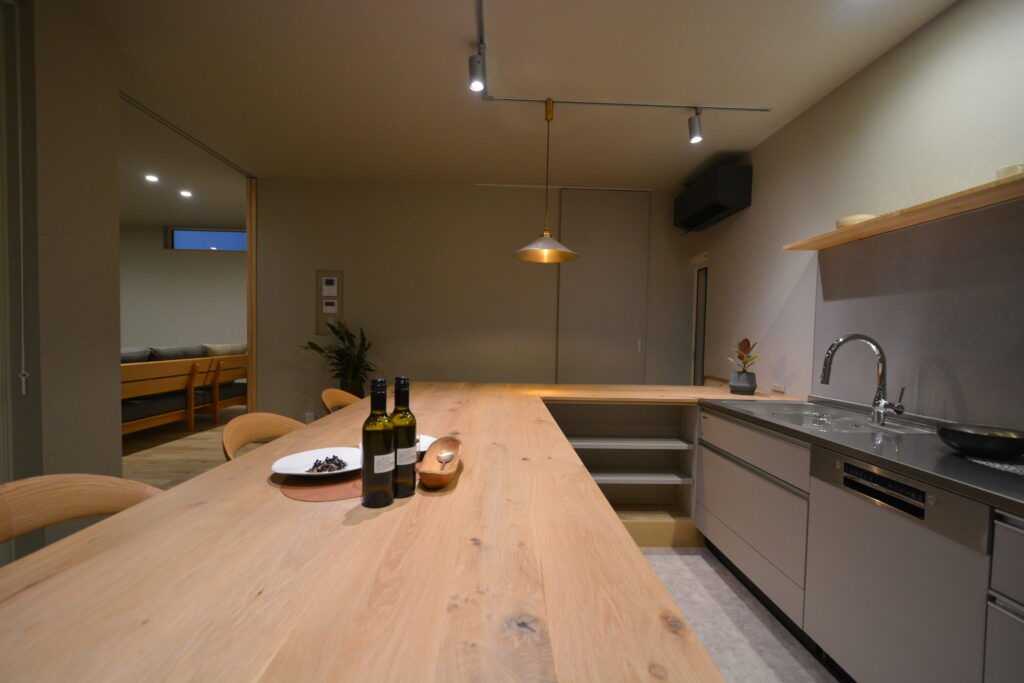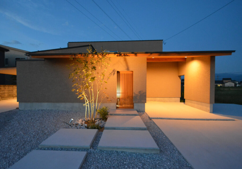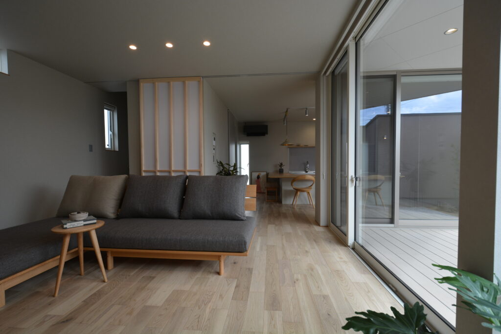 大工技術に自信のあるPRESTOが設計事務所とタッグを組んだ【和モダン×カーテンを開け放て暮らす家】。 和の庭がある玄関アプローチから中へ入ると、ウォームグレイで仕上げたおしゃれなリビングダイニングキッチン。センス良くワントーンでまとめたインテリア。思いっきりカーテンを開け放てるリビング。細部まで美しく整えた上質な空間です。